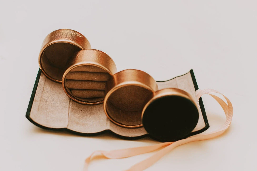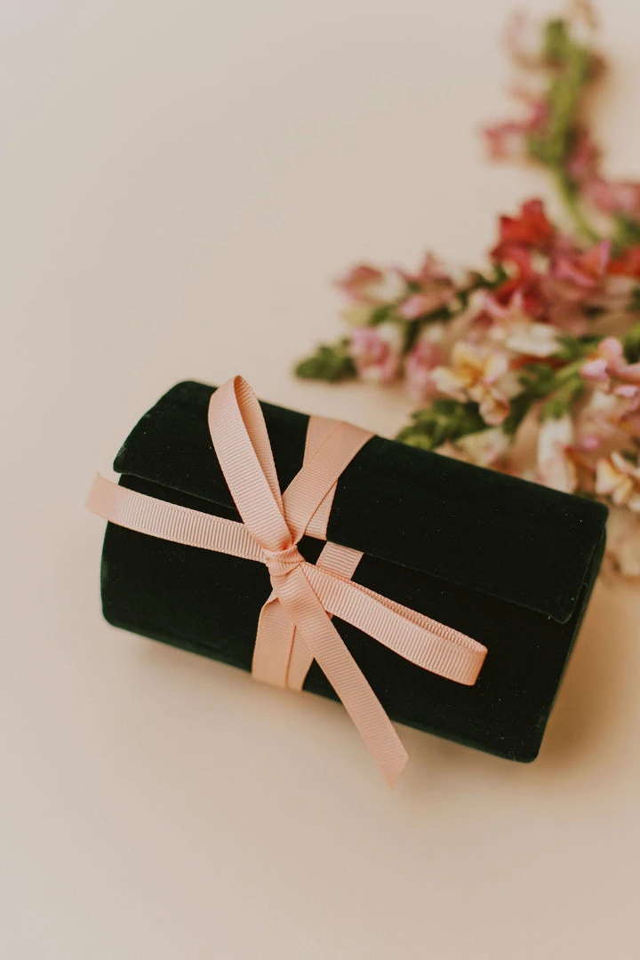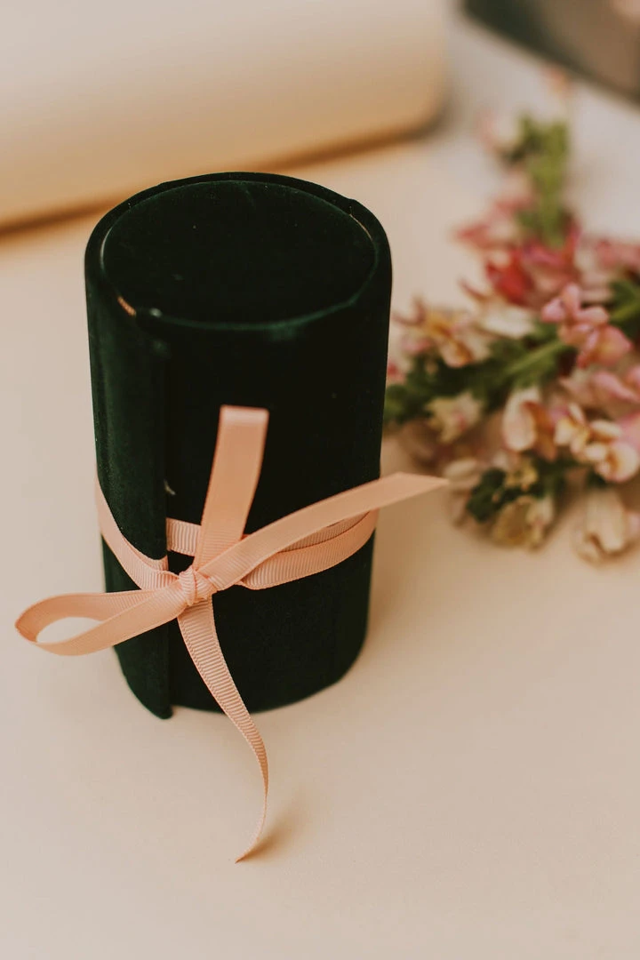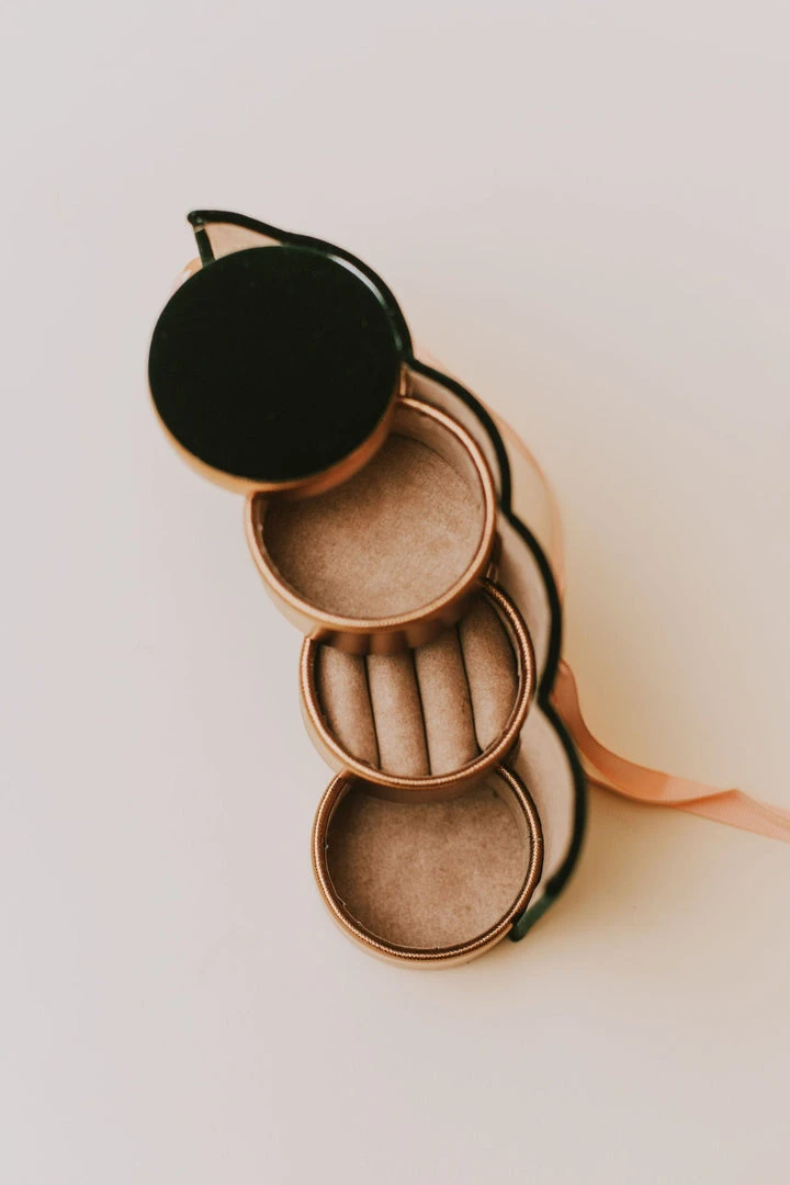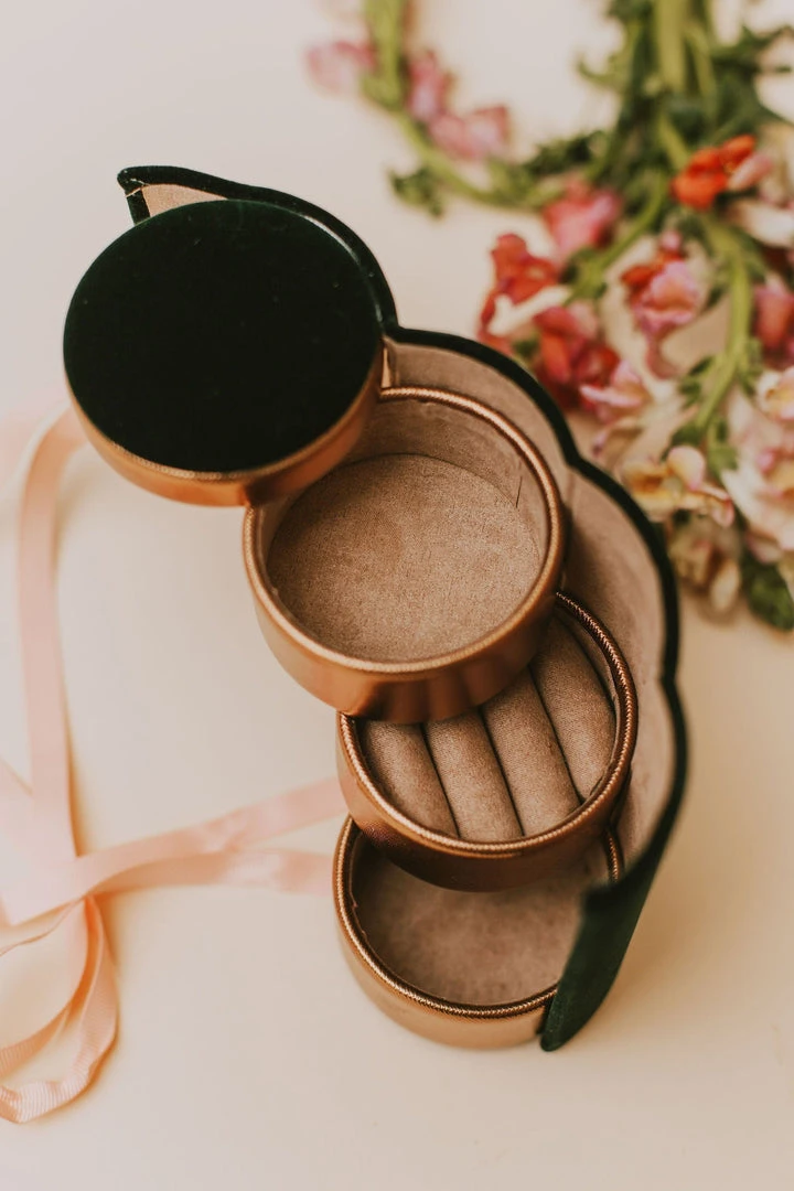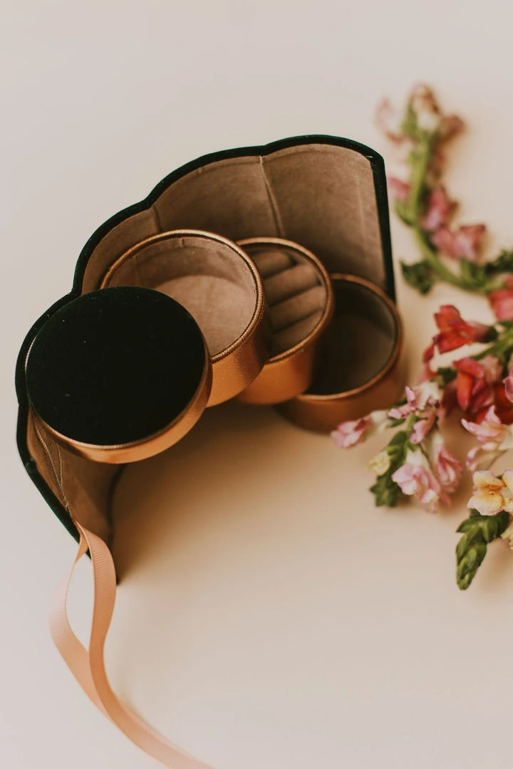 Plush velvet outer with a ribbon tie enclosing three solid pot compartments to keep precious trinkets safe and secure while you travel.